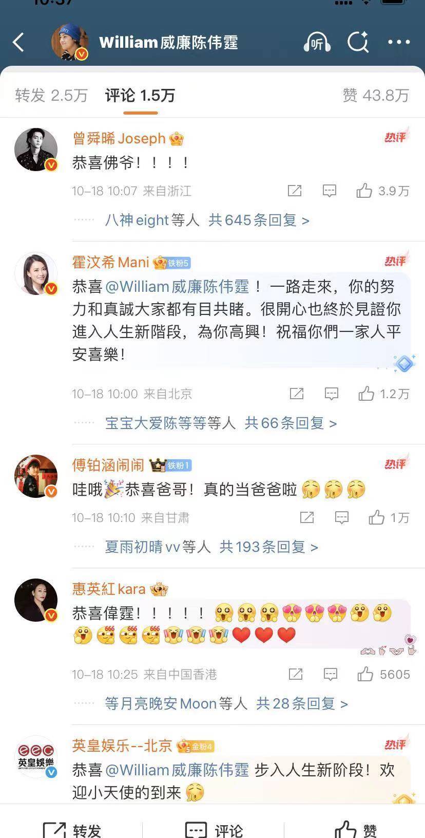 众星都纷纷给陈伟霆送上祝贺,曾舜晞、霍汶希、惠英红、英皇公司、谭耀文等,陈伟霆进度条直接拉满,也是让人很惊喜。